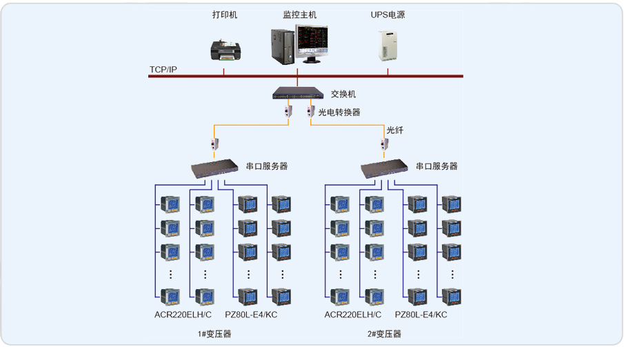 吳淞中心醫(yī)院電能管理系統(tǒng)監(jiān)控范圍變電所內(nèi)智能儀表的運(yùn)行參數(shù),吳淞中心醫(yī)院共一個(gè)變電所,變電所內(nèi)有2路變壓器(1#變壓器、2#變壓器)出線及93路普通饋線。進(jìn)線回路采用ACR220ELH多功能諧波儀表,普通饋線回路采用PZ96L-E4/C智能可編程電力儀表。整套電能管理系統(tǒng)站控管理部分包括監(jiān)控管理主機(jī)、打印機(jī)、UPS電源等;網(wǎng)絡(luò)通訊層部分包括一個(gè)16口的串口服務(wù)器;現(xiàn)場(chǎng)智能儀表監(jiān)控設(shè)備層由ACR220ELH和PZ96L-E4組成。該配電系統(tǒng)分布在一個(gè)變電所內(nèi),2臺(tái)變壓器的所有電力儀表通過RS485總線連接至串口服務(wù)器,并經(jīng)過超五類網(wǎng)線上傳至監(jiān)控后臺(tái)。
