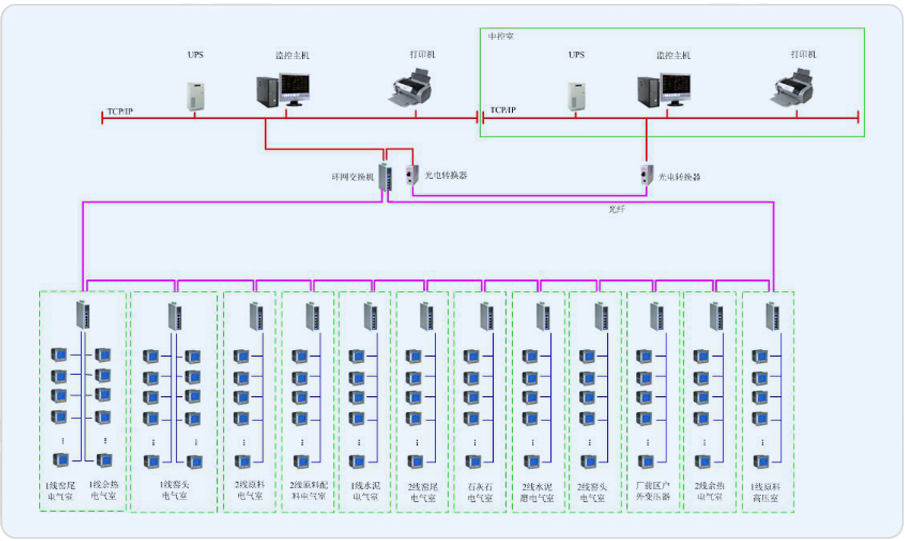 中材萍鄉(xiāng)水泥有限公司已于2011年在新線35kV總降變電所建成智能配電管理系統(tǒng),實現(xiàn)對總降變19個用電回路的計量。由于企業(yè)的智能化管理需求,需要對整個廠區(qū)關(guān)鍵生產(chǎn)設(shè)備的科學(xué)管理,對重點用電回路的用電狀況進行全過程連續(xù)監(jiān)測、集中控制、統(tǒng)一調(diào)度,同時按照國家有關(guān)節(jié)約能源的法規(guī)、標(biāo)準(zhǔn)及行業(yè)有關(guān)規(guī)定,制定各用能部門、主要耗能設(shè)備和生產(chǎn)工序(工藝)的能耗定額,并將各項定額逐級下達,并對定額的完成情況進行考核和獎懲。