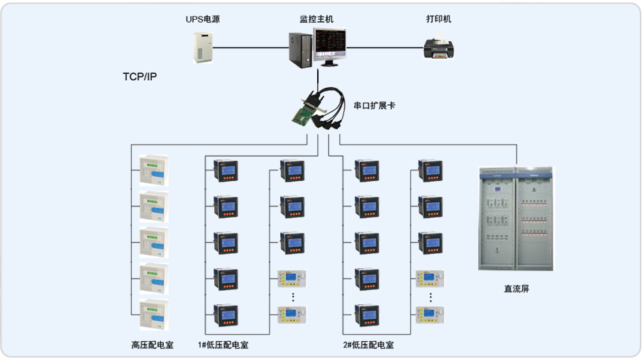 整個系統(tǒng)采用分布式結(jié)構(gòu),高壓配電室、低壓配電室1#、低壓配電室2#內(nèi)現(xiàn)場設(shè)備均采用RS485總線直接接入監(jiān)控主機(jī)擴(kuò)展卡的串口。對于每個回路采用ACR多功能儀表,共126個回路;站控層應(yīng)用國內(nèi)知名的聯(lián)想商用計(jì)算機(jī)作為監(jiān)控主機(jī),同時設(shè)有用于報表打印輸出的打印機(jī);防止異常斷電而引發(fā)的數(shù)據(jù)丟失的UPS設(shè)備。監(jiān)控軟件平臺采用單機(jī)版Acrel-3000型電能管理系統(tǒng)。Acrel-3000型電能管理系統(tǒng)預(yù)留了擴(kuò)展接口,可方便進(jìn)行擴(kuò)展。