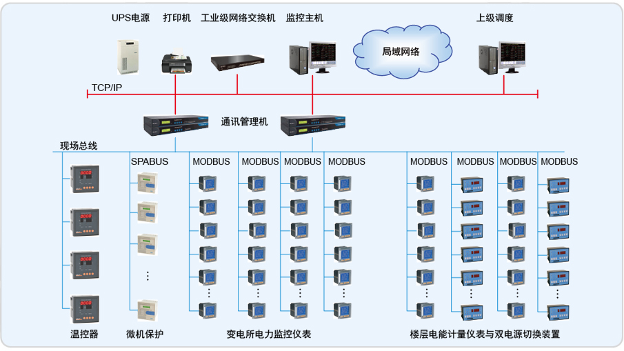 整個系統(tǒng)采用網(wǎng)絡(luò)分布式結(jié)構(gòu),監(jiān)控主機(jī)位于地下一層變電所值班室內(nèi),各變電所配電柜內(nèi)安裝有本公司ACR230ELH、ACR220EFLK儀表共計200多回 路。系統(tǒng)采用開放的通訊協(xié)議,通過現(xiàn)場總線與高低壓配電系統(tǒng)、變壓器溫控裝置、發(fā)電機(jī)的智能接口、ATSE及EPS等相連,實(shí)現(xiàn)數(shù)據(jù)通訊功能。同時監(jiān)視系統(tǒng)提供標(biāo)準(zhǔn)的RS485接口向上連接到BMS系統(tǒng)。