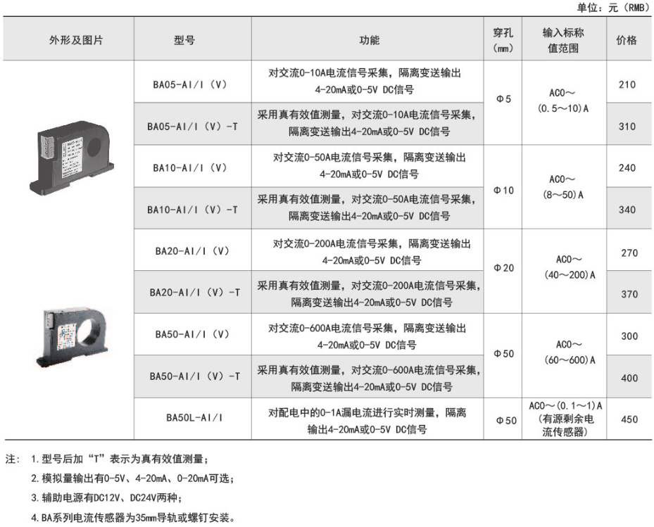 BA系列產品應用電磁感應原理,對電網中的交流電流進行實時測量,將其隔離變換為標準的直流信號輸出。應用于工業自動化領域。具體型號:BA10-AI/I技術要求:輸入電流AC 0-50A;輸出DC 4-20...
