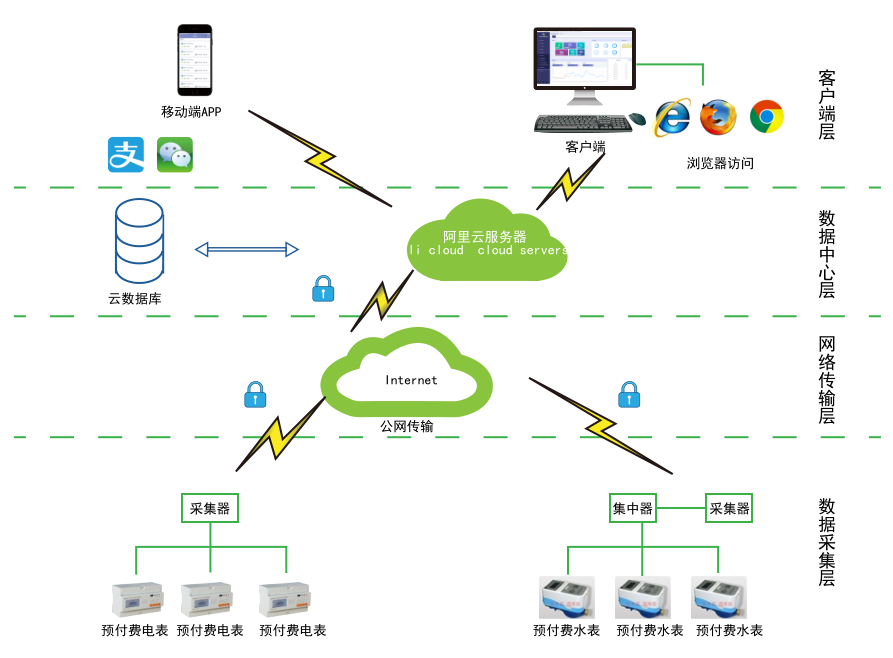 對于分布不同省、地市或同地市不同區域的連鎖商業、集團、百貨、門店、物業、院校等業務分散,要求集中管理、線上支付,低額提醒、欠費告警。但常規的本地插卡付費、本地預付費并不能完全滿足客戶管理需求,預付費云平臺應運而生。AcrelCloud-3200水電預付費云平臺無縫集成商業、物業公司、集團企業、院校等分散布置的安科瑞DDSY/ADF系列電子式預付費電能表、閥控智能水表等,提供微信、支付寶、銀聯等可選的在線支付方式,大大方便了用戶充值、圈存,提供預警和充值、退費、電能消耗等記錄查詢,方便用戶和管理方的數據統計和財務分析,提供先交費后使用的管控機制,大大降低了管理部門的收費成本。
