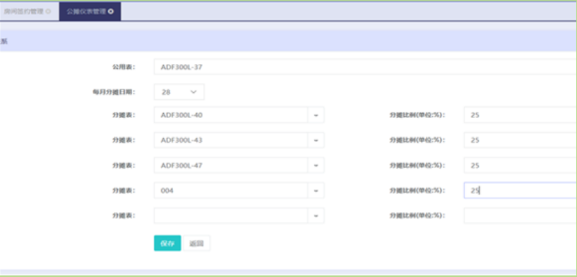 指定某塊表為主表,然后分配關聯子表,系統每個月自動將主表的用電按比例換算成電費從子表中扣除,這樣可以剩余人工統計的麻煩。