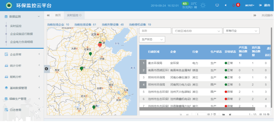 點位運行情況分析:按行業或區域統計分析企業、監測點、產污設施、治污設施等數量及運行狀態。
