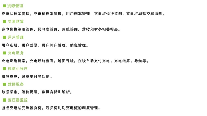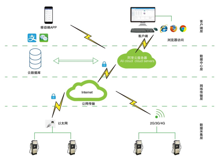 充電樁可選配WIFI模塊或GPRS模塊接入互聯(lián)網(wǎng),配合加密技術和秘鑰分發(fā)技術,基于TCP/IP的數(shù)據(jù)交互協(xié)議,與云端進行直連。云平臺包含了充電收費和充電樁運營的所有功能,包括財務管理、變壓器監(jiān)控和運營分析等功能。