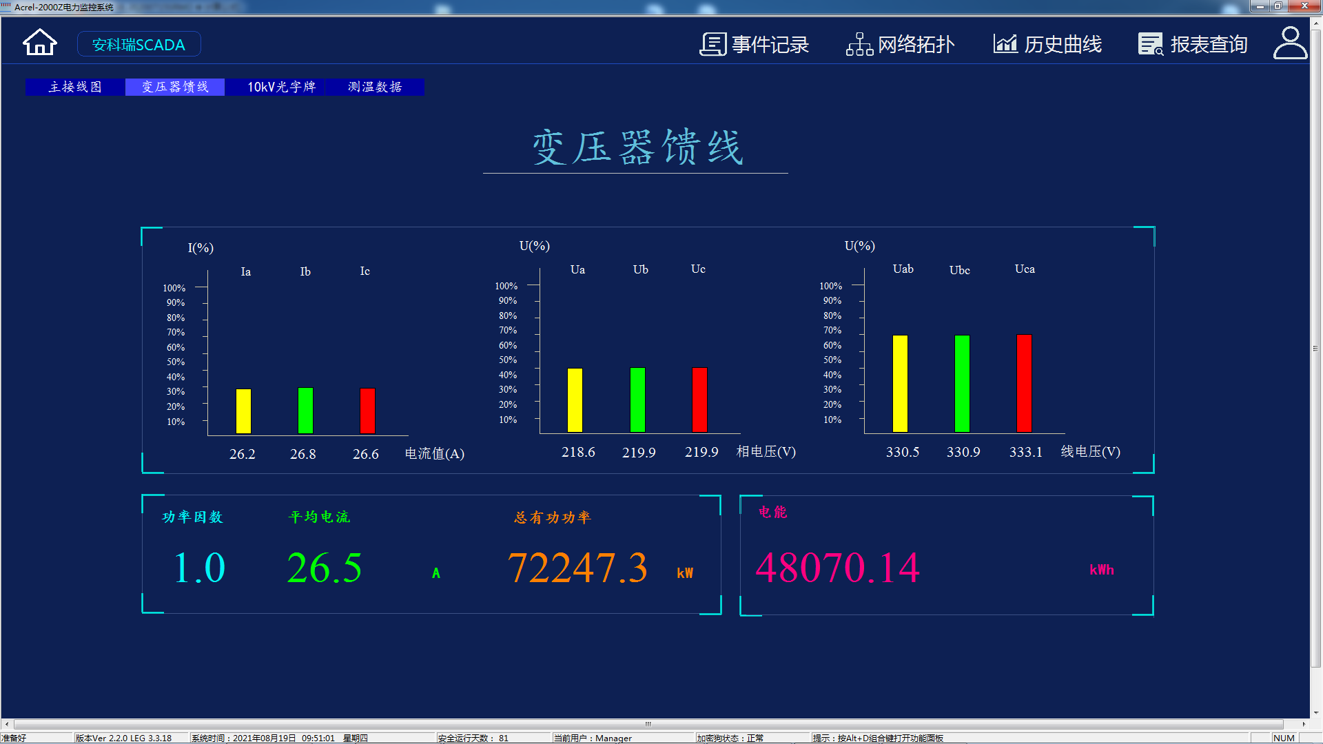 Acrel-1000綜合自動化監控系統在配電一次圖中,可以直接查看該回路詳細電參量,界面也可用棒圖的形式更直觀的展示三相電流、三相電壓、有功功率、無功功率、功率因數、電能等。